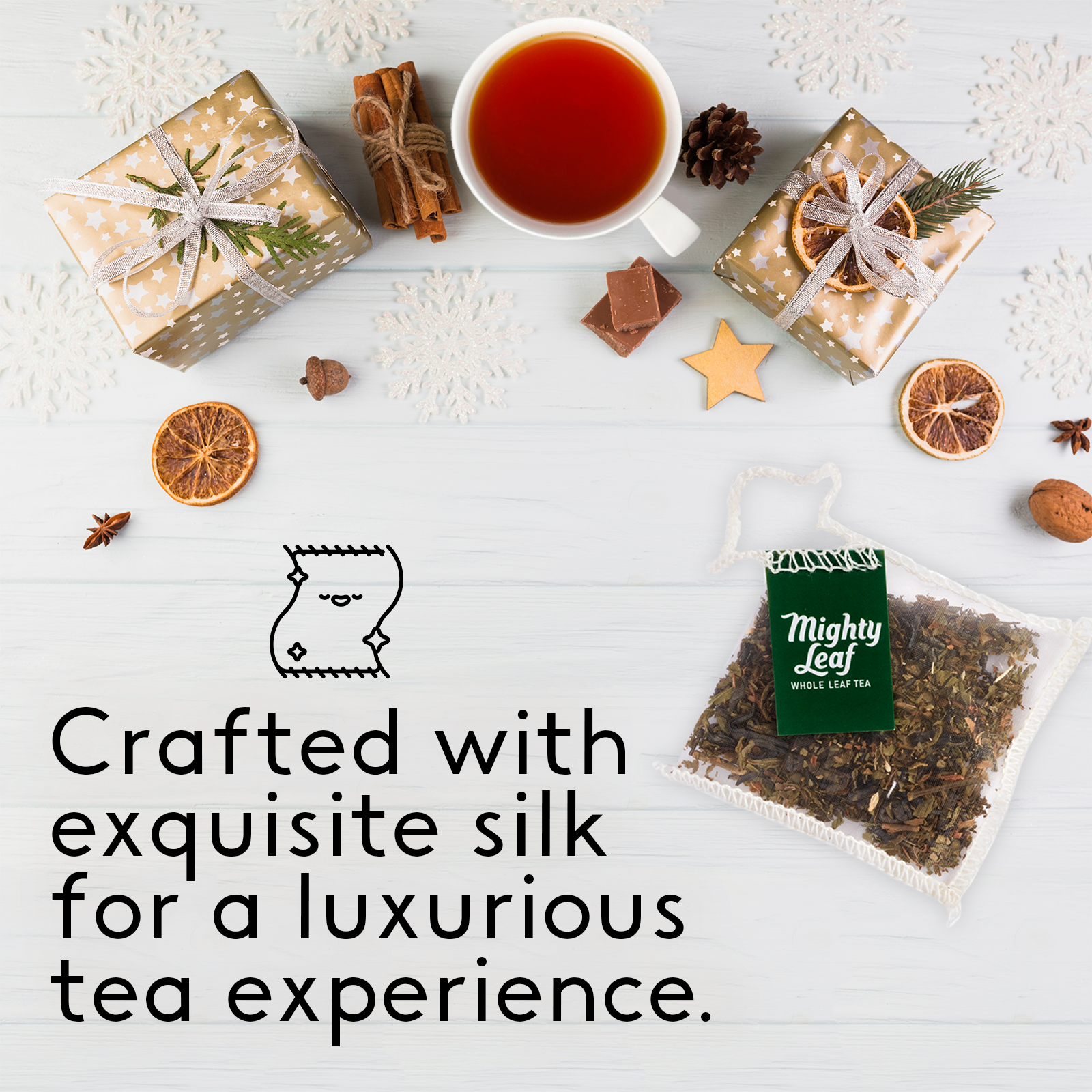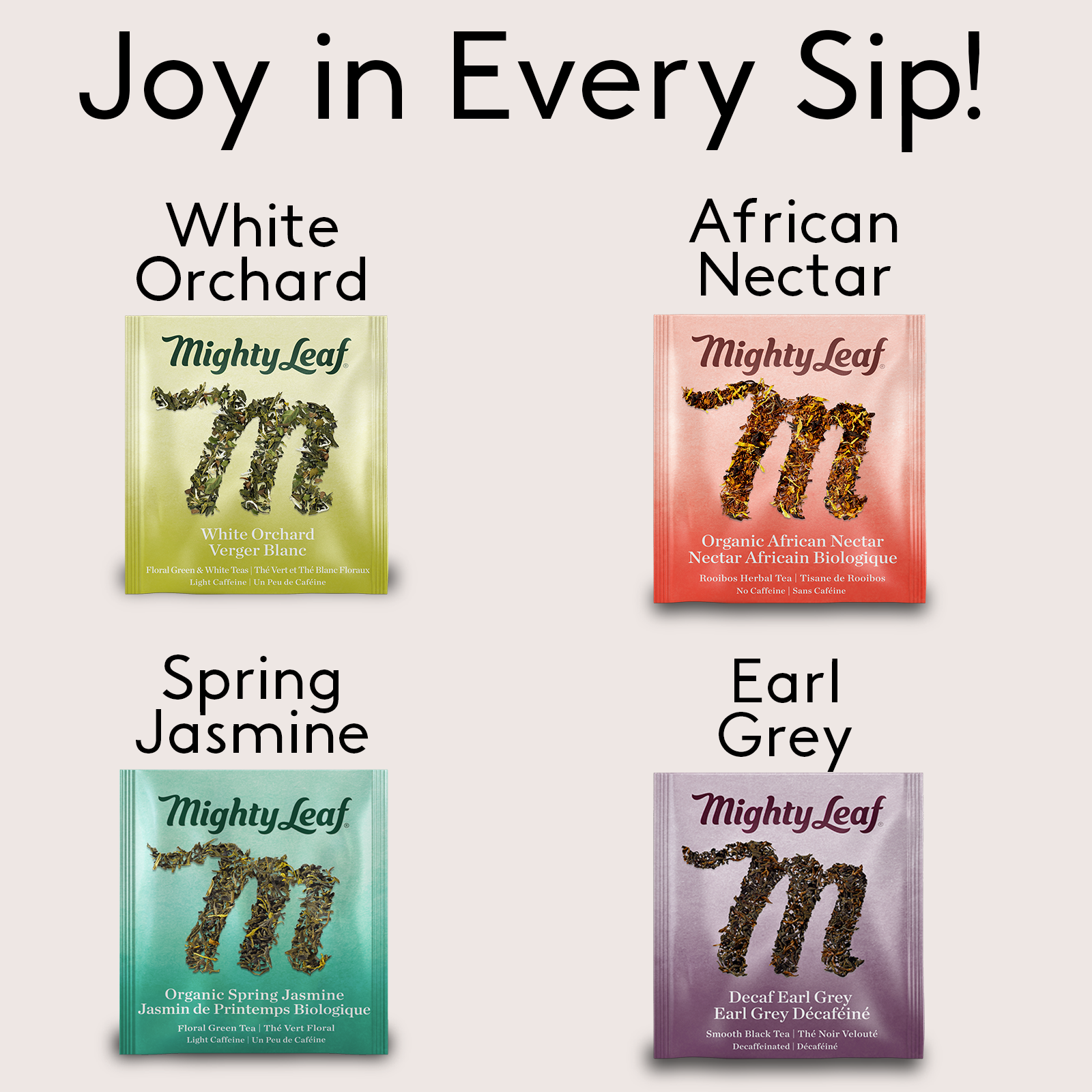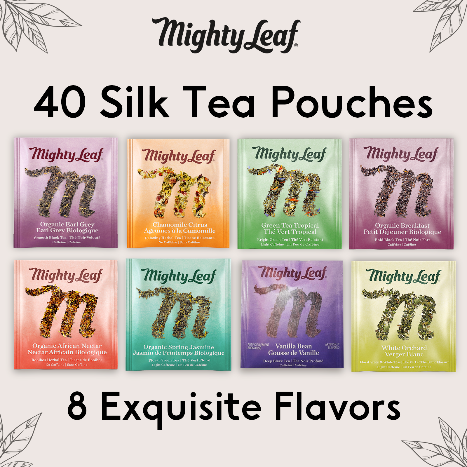 iscover a world of flavors with the Mighty Leaf Tea Gift Box, a beautifully curated variety pack that makes a perfect gift for tea enthusiasts. This set includes 8 distinct flavors, each with 5 individually wrapped pouches, allowing you to enjoy a rich and aromatic tea experience. Crafted with care, each Mighty Leaf tea brings out bold, nuanced notes that are ideal for any time of day.